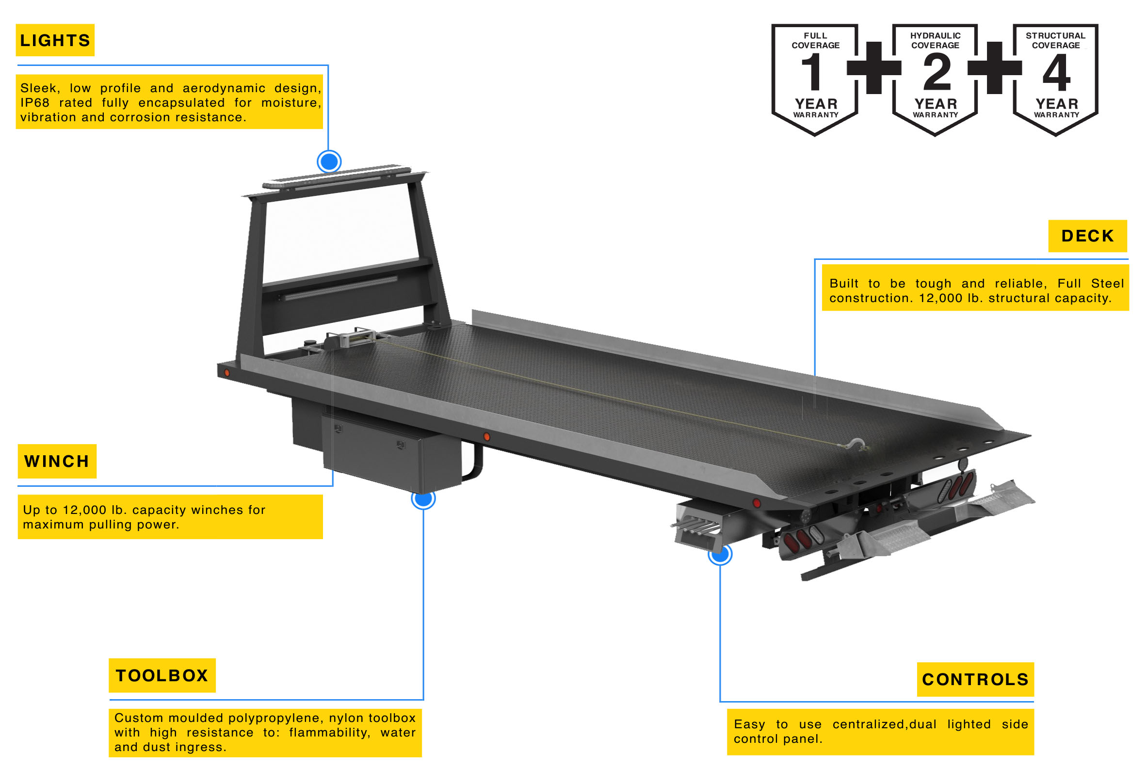 Our exclusive light duty car carriers offers the lowest load angle in its class, for clearance on even the lowest profile vehicles. It features our exclusive design & technology for less